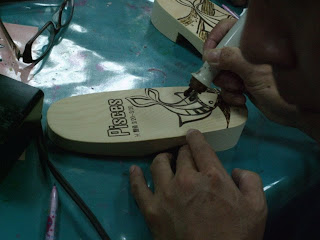 畫筆是「電燒筆」;木屐電燒即是以電燒筆在木屐台上進行各種繪畫與圖案設計